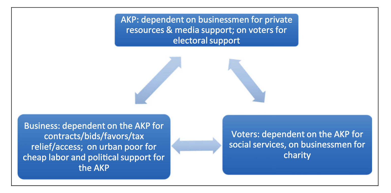 • At the root of the AKP’s democratic backsliding lays extensive capital accumulation and resource allocation for a cross-class coalition composed by the rising economic elite and the urban poor, respectively.