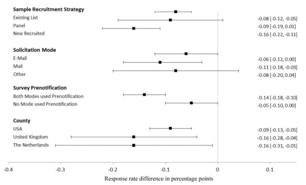 - comparing web surveys to other modes (mail and telephone), web surveys show significantly lower response rates
