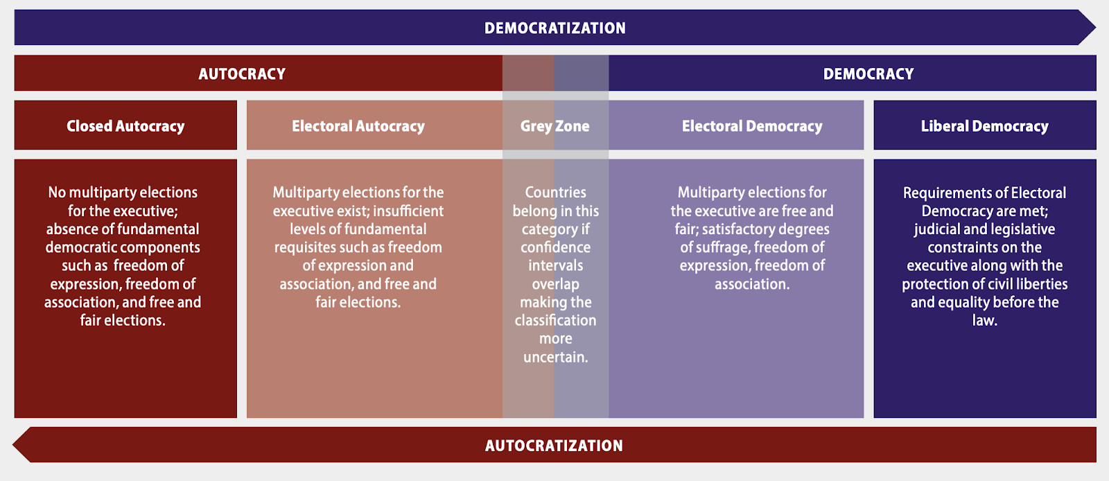 - Two dimensions: Competition and participation with eight institutional guarantees (Dahl, 1971)